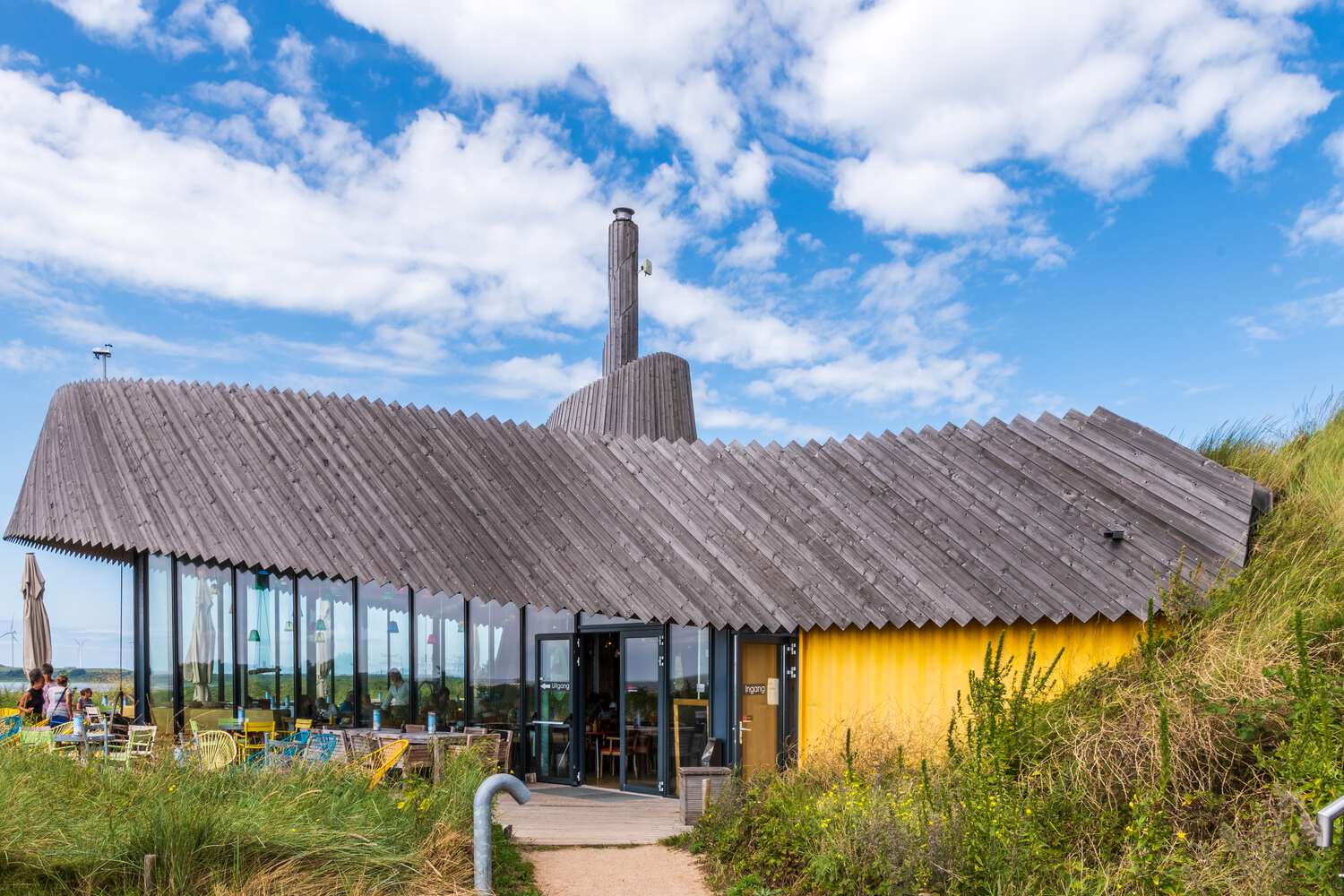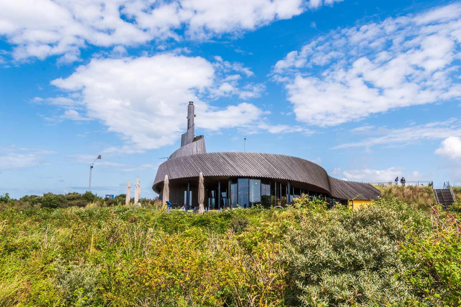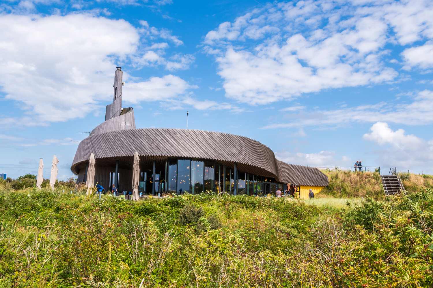 Een restaurant in de duinen bij Oostvoorne in een bijzonder ontwerp en op een aparte locatie, middden in de duinen en de natuur maar met uitzicht ook op de Haven van Rotterdam.